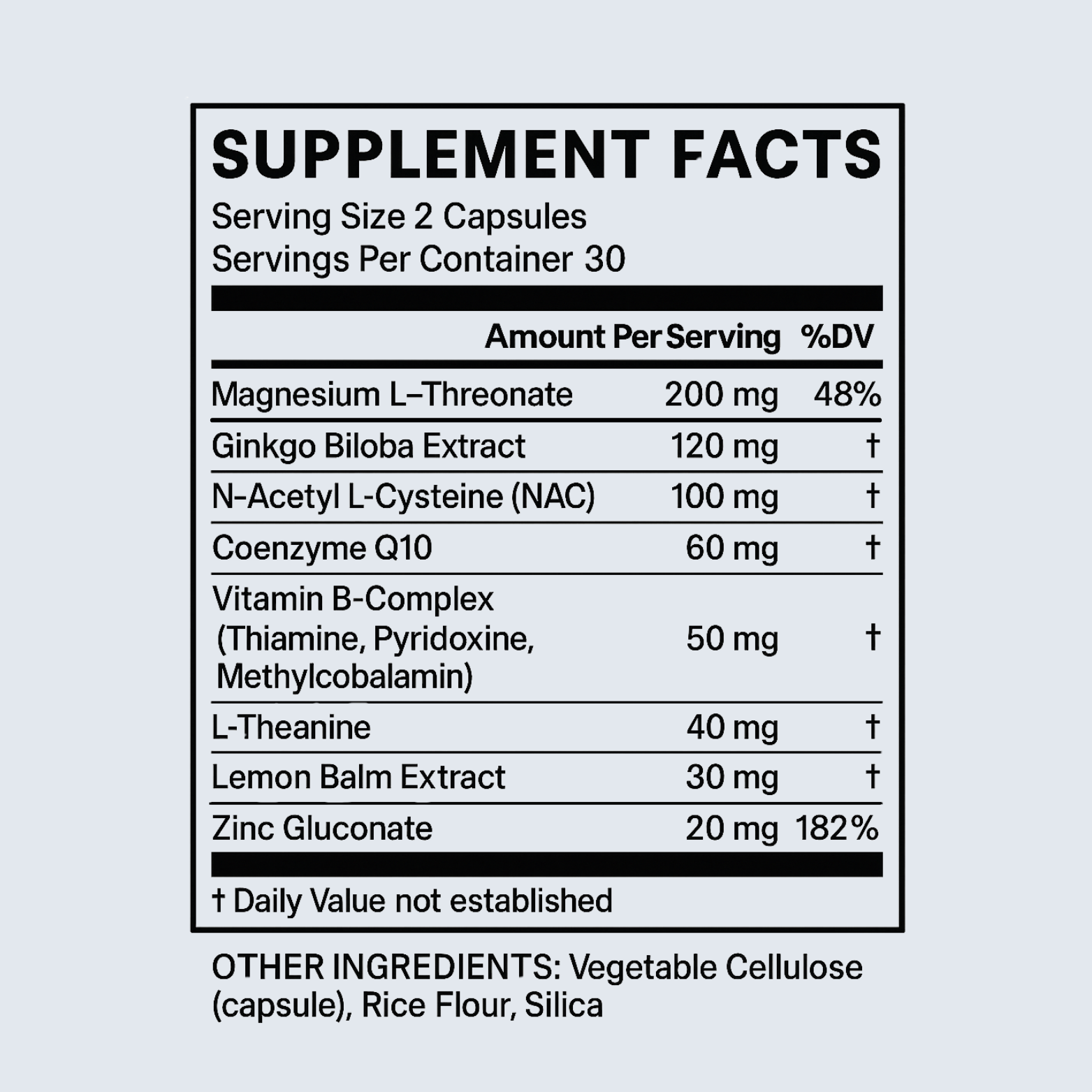 Magnesium L-Threonate, Ginkgo Biloba Extract, N-Acetyl L-Cysteine (NAC), Coenzyme Q10, Vitamin B-Complex (Thiamine, Pyridoxine, Methylcobalamin), L-Theanine, Lemon Balm Extract, Zinc Gluconate, Vegetable Cellulose (capsule), Rice Flour, Silica.